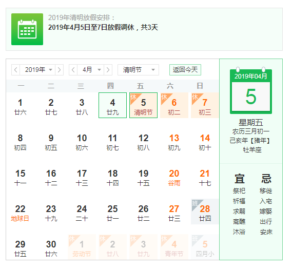 1、4月5日至7日放假調(diào)休,共3天。4月8日(星期一)上班。